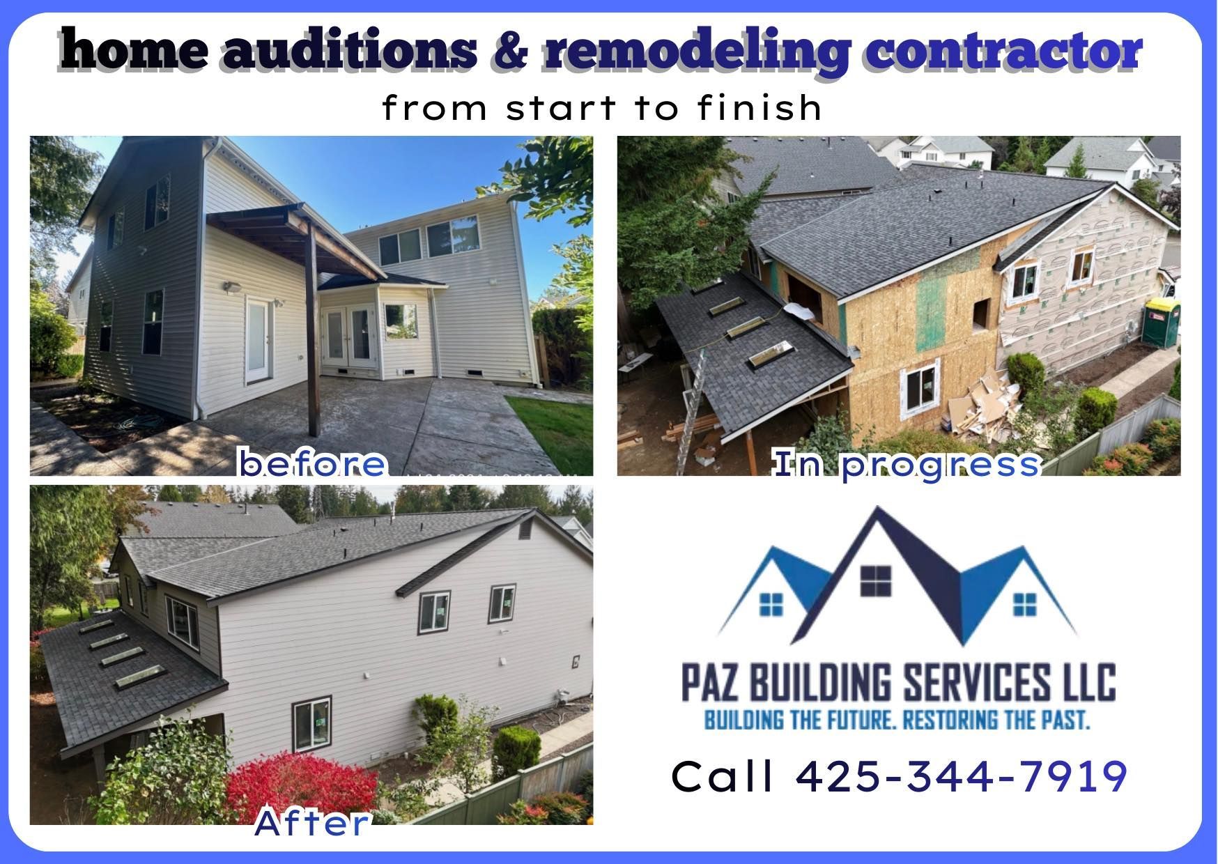 At Paz Building Services LLC, we handle the project from start to finish. Count on us for kitchen and bath remodeling, home additions, roofing, exterior painting, decks and restoration services. Call (425) 344-7919 for a FREE estimate or consultation.